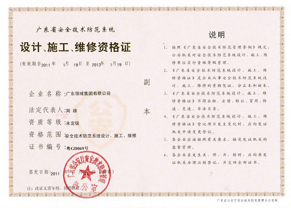 廣東領域集團有限公司成功申辦并獲得(de)《廣東省安全技(jì)術(shù)防範系統設計(jì)、施工、維修資格證》